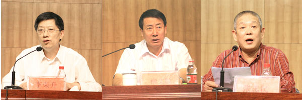 省属高校学习实践活动指导检查组二组组长、山东师范大学原党委副书记李荣升(左),院党委书记、院学习实践活动领导小组组长柳文敏(中)分别作重要讲话;张志民院长主持会议。