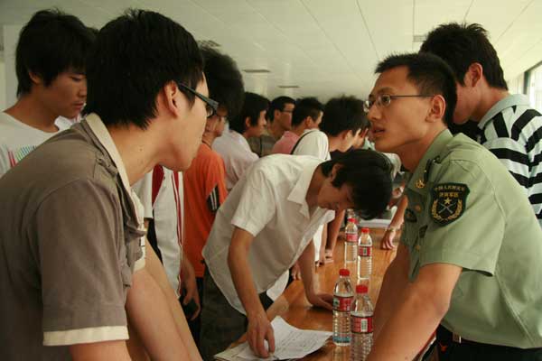 为响应国家新的就业政策,我院学生处、人民武装部协同长清区武装部面向2009届毕业生进行入伍预征工作。 6月15日上午9时30分,入伍预征工作在长清校区艺文楼一楼大厅拉开帷幕。