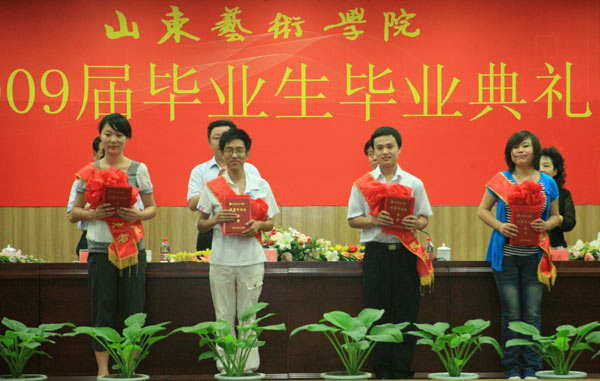 党委副书记、纪委书记刘致兴宣读了《关于表彰2009年度优秀毕业生的决定》、《关于授予陈华、赵波、孙娜、张怀玉同学校级优秀毕业生和青年志愿者的决定》,对音乐学院王伟等122名被山东省人事厅、教育厅授予“省级优秀毕业生”称号的同学和四位志愿服务西部的毕业生同学进行了表彰并颁发证书。