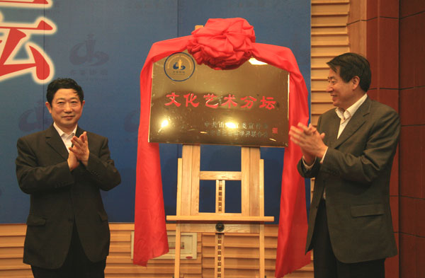 省委宣传部张全新副部长与党委书记柳文敏为“齐鲁讲坛•文化艺术分坛”揭牌