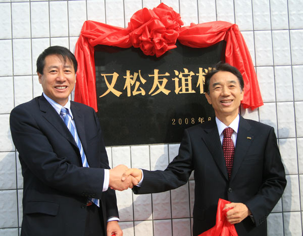 党委书记柳文敏和金圣经理事长共同为友谊楼揭牌
