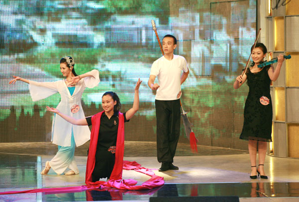 在节目开始的“魅力展示”时段,戏剧学院臧笑楠老师在梅兰芳《天女散花》音乐的伴奏声中,以一段飘逸灵动的红绸舞拉开了高校教师专场的序幕。长绸的悠美弧线划过后,臧笑楠以惟妙惟肖的“吃”糖葫芦的无实物表演,让观众们捧腹不止。任彦老师则以一段柔美的印度舞带观众体味了印度味儿十足的异国风情,并在舞蹈结束后用印度舞中曼妙的手语与主持人进行交流,引得台下观众纷纷效仿。赵小璐教师为观众们献上了一曲《霍拉舞曲》,将欢腾的乡村舞会场面用音乐呈现在大家面前,并用几个漂亮的滑音将主持人和嘉宾的名字用小提琴拉出来,让大家领略了音符的妙趣横生。王琛为观众们演唱了京剧《赵氏孤儿》选段,以饱满圆润的唱腔再现了国粹艺术的魅力。