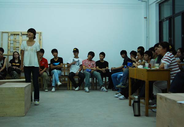 在戏剧学院,麻淑云教授对表导演专业2007级学生进行了即兴表演测试,测试内容是以一束花和一盒烟为道具,自己创造情景,测试的目的是考察同学们在基础课程中的基本能力。参加测试的同学态度认真,整个测试现场秩序井然。