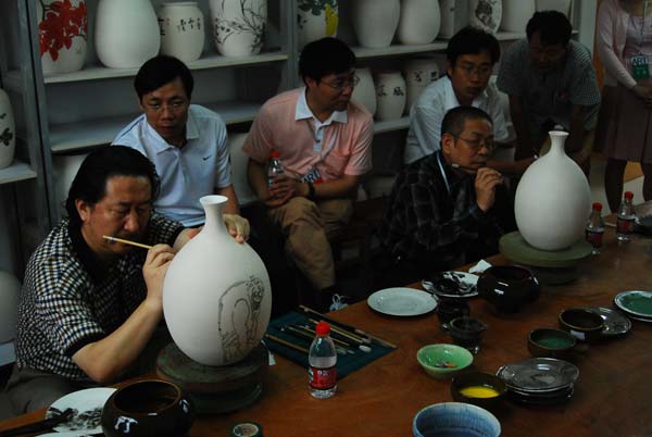 在历城二中,专家及陪同人员一行在美术学院谭开界老师的介绍下,先后参观考察了陶艺材料室、拉胚室、烘干室及窑炉室。在陶艺馆,专家组组长杨晓阳教授和我院院长张志民教授还现场挥毫进行了陶绘创作。随后,专家组成员应邀同历城二中负责人及我院美术学院实习基地相关人员进行了座谈,提出了加强实习基地在本科美术教学中的作用的相关意见。