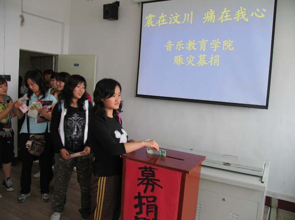 一方有难,八方支援。面对突如其来的惨重灾情,我院师生纷纷伸出温暖的双手,为帮助灾区抗震救灾和受难同胞渡过难关献上自己的爱心。14日下午,院工会等向全院师生发出了为灾区捐款的倡议,倡议迅速得到了全院师生的积极响应。学院领导带头捐款。广大教师慷慨解囊,在捐款簿前毫不犹豫地签上字、捐上钱;一些行动不便的老教师和因事外出的教师,纷纷委托同事或家人代为捐款。音乐教育学院率先在学生中发起捐款活动,其他学院也陆续展开。同学们虽然目前还没有收入,但仍都以微薄之力为灾区人民献上自己的一份真情,5元、10元、30元、50元、100元,很多同学把自己本已紧张的生活费投进了募捐箱,捐款的同学们络绎不绝,捐款的数额在不断增长……