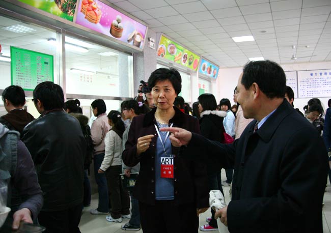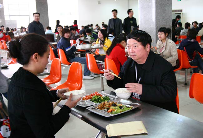 3月24日中午,教育部预评估专家组组长、中央文化管理干部学院副院长嬴枫教授,专家组成员云南艺术学院院长吴卫民教授,西安音乐学院副院长白陆平教授,天津美术学院原教务处处长蒋志华教授,青岛大学研究生处处长夏东伟教授,专家组秘书山东大学教务处高凯教授一行在结束一上午的听课、走访、座谈之后,来到我院长清校区餐厅考察,询问食堂伙食标准和质量,了解师生在校的生活情况等,并与师生共同就餐。