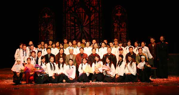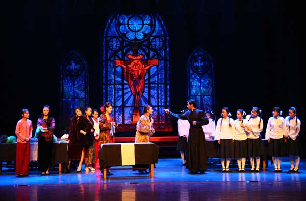 《秦淮悲歌》是由我院戏剧学院学生根据荣获“百花奖”等多项文学大奖、著名旅美作家严歌苓的中篇小说《金陵十三钗》自编、自导、自演的。整个作品从构思、改编、排练到演出,仅用了半年时间。该剧气势恢宏,场面震撼,充分调动了现代舞台艺术的诸多表现手段,灯光炫妙奇幻,音乐震慑人心,以冷峻的手法、强烈的节奏与剧情对比,表达了国家之祸、华夏儿女之痛。