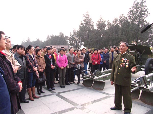 图片:参观人员在听老解放军战士讲述济南战役情况。