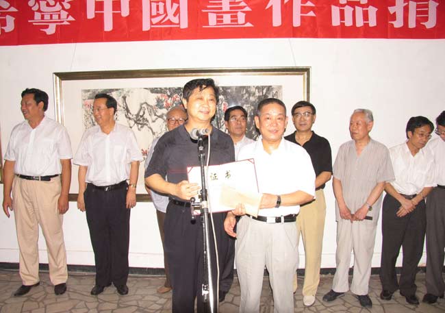 省人大常委会副秘书长付新元代表于老亲属致词,他说山东艺术学院是于老长期工作、生活的地方,于老先生一生从事中国画艺术研究与美术教育,培养了许多优秀人才,可谓桃李满天下。出于对中国美术的执着和对教育事业的一点心意,去年他曾向中国美术馆捐赠个人作品百余幅,今天他又将60幅作品捐献给他长期工作和学习的艺术学院,以此期望山东新人辈出,美术教育事业蓬勃发展。