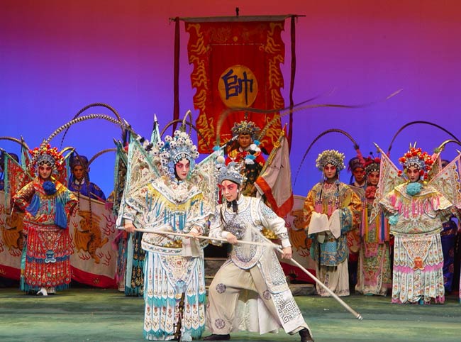 《杨家将》是家喻户晓的古代传奇故事,讲述宋朝大将杨令公一家为国效力、保家卫国的故事。根据此故事改编的传统京剧《杨门女将》自上演以来就受到了观众们的喜爱,许多唱段都被视为经典之作。我院戏曲系在前一段时间将此剧重排。我院副院长、京剧表演名家、“梅兰芳金奖”获得者郭跃进悉心参与指导,并和戏曲系师生一起将此剧作为本次“艺苑金秋”艺术节的重头戏搬上舞台。演出期间,演员们唱、念、坐、打不温不火,恰到好处,将杨门女将巾帼不让须眉的飒爽英姿和精忠报国、荡气回肠的爱国主义气概表现得淋漓尽致,赢来了观众们阵阵热烈的掌声和喝彩声,这也让本场晚会成为了本次艺术节的一大亮点。