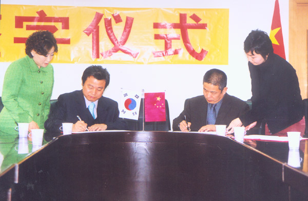 图片:我院院长张志民与亚细亚大学副校长金永睦博士正在签署两校校际友好关系正式协议