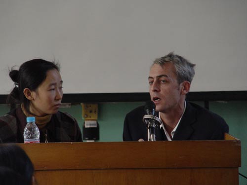图片:15日下午,洛朗.戈丹在我院讲座现场。 近期,作为中法文化交流年――法国年的重要活动,“城市红装”法国当代雕塑艺术展已经走进人们的视线,参展艺术家的作品陆续被安置在泉城广场上,11月19日,“城市红装”法国当代雕塑艺术展将在这里举行。 15日,应邀参加雕塑展的法国著名艺术家洛朗.戈丹,在该展两位策划人的陪同下到达我院,并在十四教室举办学术讲座。洛朗.戈丹先生以其独特的观点和新锐的思考使现场听众在中法高等艺术的直接对话中深受启发,加深了对艺术尤其是当代艺术的理解。