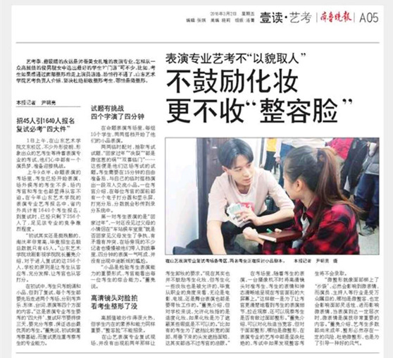 高颜值被炒作得很火热,但学生内在的素养和能力同样重要,“整容脸”不能招录。在山艺表演专业复试现场,并没有出现前两年那样让考生卸妆的要求。“现在其实也并不鼓励考生化妆,但考生化一些淡妆也是被允许的,毕竟从职业的角度来看,无论是电影、电视,还是舞台表演也都是要带妆工作的。”董亮介绍,但对学校来说,允许化妆指的是适度化妆,如果化妆是为了遮蔽某些瑕疵是不可以的。“比如有的考生为了遮挡比较宽的面部,用垂下来的头发遮挡面颊,这其实都逃不过考官的法眼。”