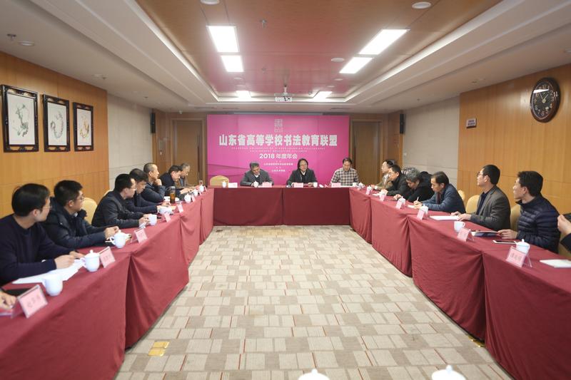 11月19日,由山东省高等学校书法教育联盟主办、山东艺术学院承办的山东省高等学校书法教育联盟2018年度年会在济南召开。中国书协理事、山东省书协常务副主席兼秘书长孟鸿声,山东艺术学院党委书记马东骅、院长王力克,曲阜师范大学书法学院党委书记姜晓强、副院长陈涛、教授朱乐朋、副教授徐传法,临沂大学美术学院书法系副教授房彬、教师张超,山东建筑大学艺术学院副教授谭延祯,齐鲁师范学院美术学院院长李广平,山东工艺美术学院造型艺术学院教师杨国栋,齐鲁理工学院艺术学院院长张胜利、教师赵华伟、李胜伟,山东艺术学院美术学院党总支书记常勇、书法工作室主任于明诠、副教授陈靖、教师贾长庆、杨建虎等出席会议。