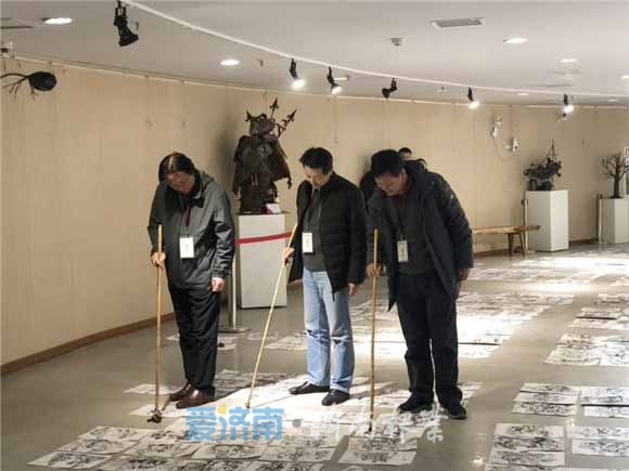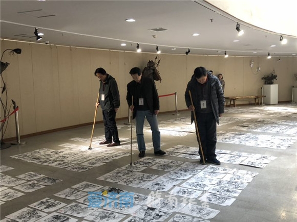 记者在阅卷现场看到,室内地面上铺满了考生的考试作品,有3位阅卷评委正在逐一阅卷,他们时而一起探讨,时而定睛思考,非常仔细。