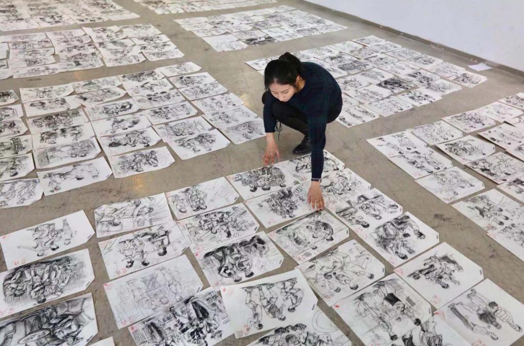 2月28日,记者在山艺长清校区图书馆看到,走廊地面上摊铺着成片的美术类考生作品,评卷专家人手一根长竹竿,对考卷位置进行调整,有时同组专家还会凑在一起分析探讨一幅画作。