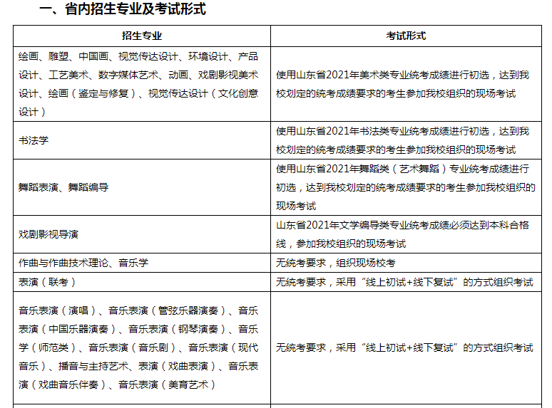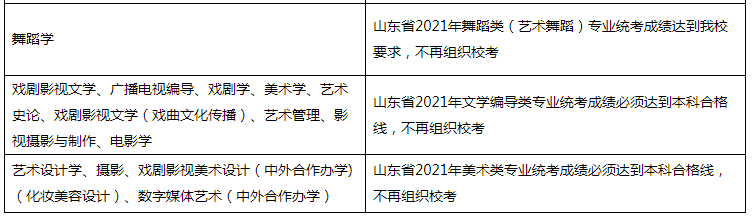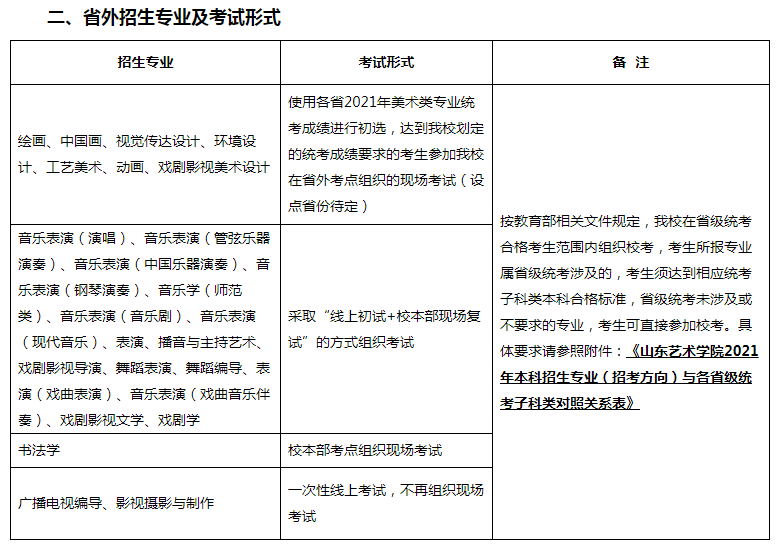 (二)具体统考成绩要求、校考报名考试安排、考试科目、录取原则等相关信息将以《山东艺术学院2021年本科招生简章》形式,通过我校本科招生信息网站(https://zsbgs.sdca.edu.cn)、山东艺术学院官方微信公众号(sdca1958)向社会公布,请广大考生及时关注。