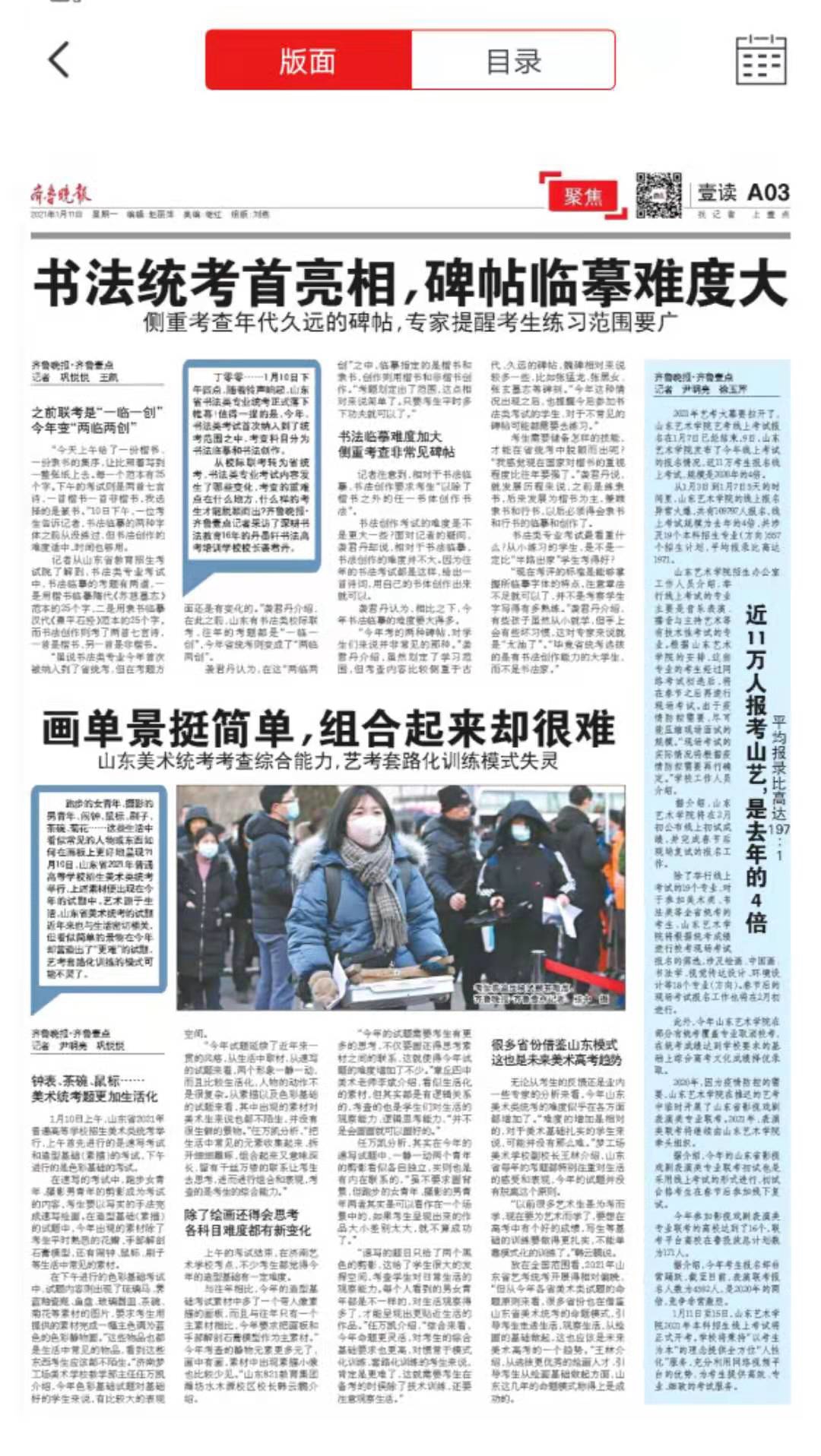 从1月3日到1月7日5天的时间里,山东艺术学院的线上报名异常火爆,共有109797人报名,线上考试规模为去年的4倍,共涉及19个本科招生专业(方向),557个招生计划,平均报录比高达197:1。