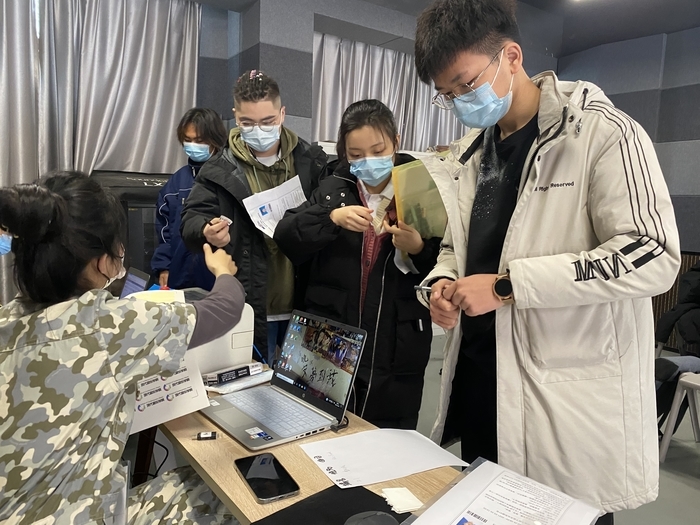 26日上午,新时报记者来到山东艺术学院文东校区音乐剧和现代音乐专业的线下考试现场。相关专业共设置了3个考场,考生分时段进行考试,每个时段考生50人左右。考生到达现场后首先进入备考室,随后分组进入编号室。每个编号室有4至5位工作人员为考生服务,考生进入后,工作人员将扫描准考证二维码信息,随机抽取考试临时编号。