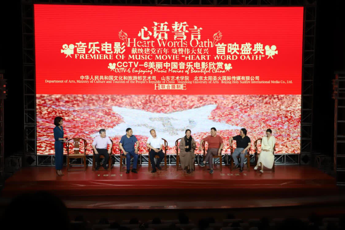 6 月 30 日,以“献映建党百年,颂赞伟大复兴”为主题,由国家文化和旅游部艺术司、山东艺术学院、北京太阳圣火国际传媒有限公司联合摄制的音乐电影《心语誓言》在山东艺术学院艺术剧场举行首映盛典。该片将于 7 月 1 日起在 CCTV-6《美丽中国音乐电影欣赏》精彩公益展映,每天播出直通年底,总时长高达900分钟。