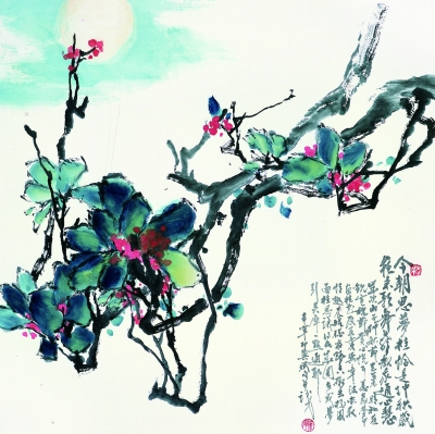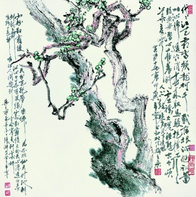 作为一个学者,不仅要具备为人称道的创造精神和专业技能,还要有垂范社会的思想和精神。先生律己以严,待人以宽,既重视画内功夫,又重视画外修养,认为人品居画品之上。他把中华民族的文化精神、大千造化的神奇灵秀及画家的精神意念融为一体,即“才德勤修养,三魂共一心”,让画之魂、人之魂、国之魂一体化,让艺术作品成为塑造、弘扬具有中华民族精神气质之美的载体。他的梅花老枝纷披,生意盎然,具有一股昂扬不坠的力量,是他体会的民族气质的集中呈现,也是一个学者型画家风范、骨气、意趣以及个性禀赋的图像化表达。