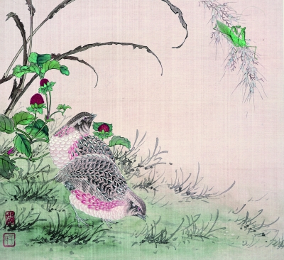 工笔花鸟册之三:鹌鹑螳螂 28厘米×30厘米 1935年