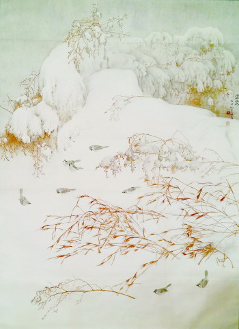 面对生机盎然的自然之竹,马麟春通过长期不懈的观察、体悟,掌握了竹子的特性,以及在风晴雨雪中的不同姿态,他尤其善画风雨、大雪之中的竹子。看马麟春笔下的风中之竹,仿若忽有一阵风过,竹叶被吹向画纸的一端,摇曳着、挥舞着,那种生机盎然之势随着风势而起,他认为,这种动感十足的风中之竹奋发着向上的力量,不畏艰难,彰显着一种正能量;而他笔下的雪竹则完全用墨色渲染出来,墨竹、白雪交相呼应,更显单纯之美。马麟春回忆说,画雪景源于1994年的一场大雪,当时和画家张丽华一起去到济南南部佛慧山的大佛头,雪后的山区完全变了模样,看着天地间一片白雪茫茫,心中异常兴奋,回去便画了第一张雪景画——《雪浴》(入选第八届全国美展并获奖),之后又陆续画了《雪野》、《雪霁》等一系列雪景画。在这些雪景工笔画中,马麟春将宋徽宗花鸟画中的工笔技巧融入作品,以“雪”为载体,完成了他在那个阶段的花鸟画探索。之后,马麟春进一步钻研写意花鸟,纯墨色写意雪竹、颜色绚丽的牡丹以及泼墨而成的荷叶都成为他的笔下之物,就如同他自己所追求的那样,画就画出自己的风格,画出自己的真情实感,不被已有的成就所禁锢,才能得艺术之精髓。