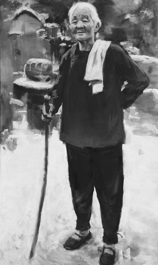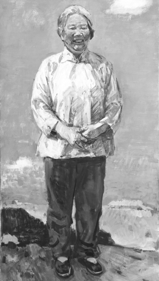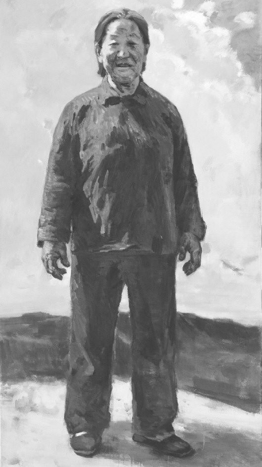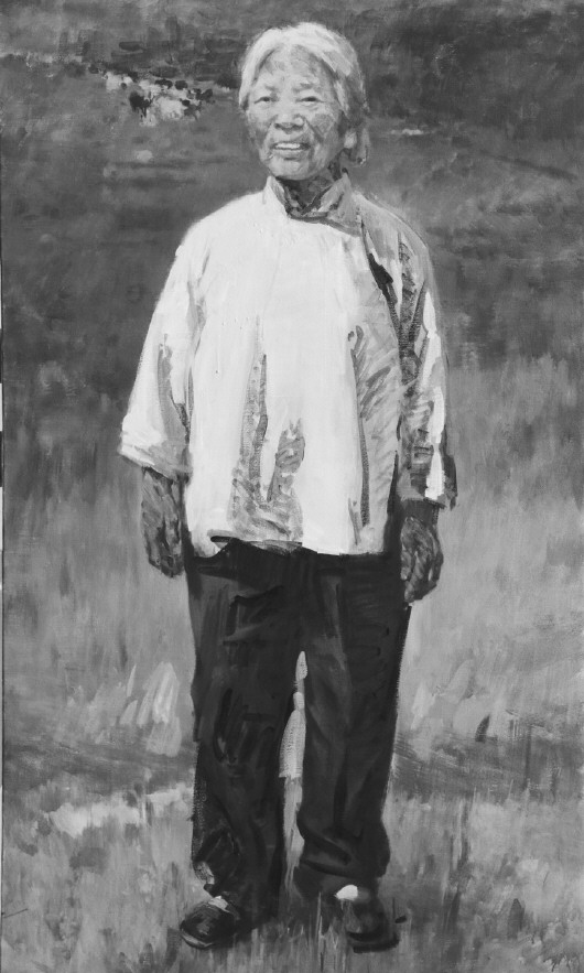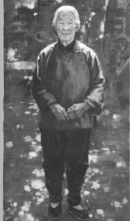 历史题材的创作必须真实地表现特定的环境和特定的人物,写实油画历来是表现重大题材的先锋,纵观美术史主题创作的杰作,无一不将油画语言这一独特的艺术魅力发挥到极致,这些作品所展现的总体布局、造型的准确和色彩的渲染之美,艺术地再现了特定的情境。在这次“沂蒙六姐妹”造像创作中,以油画的形式完成老年的形象,其特点重在写实,六位老人饱经沧桑的面容跃然画面,既亲切又真实。写实油画的根基是建立在“自然”基础上的,同时又和这种“自然”有着巨大的差别,其表现出来的结果完全不同,它将每个人一生的魅力与精彩展示在瞬间,塑造张玉梅老人半挽袖子的形象,体现了当年蒙阴烟庄村村长的雷厉风行与干练;伊淑英老人在六姐妹中形象高大,在造像中把她置身于蓝天白云蒙山沂水之间,所展现的是沂蒙的敦厚与质朴,印证了陈毅元帅说过的她们用小米供养了革命。