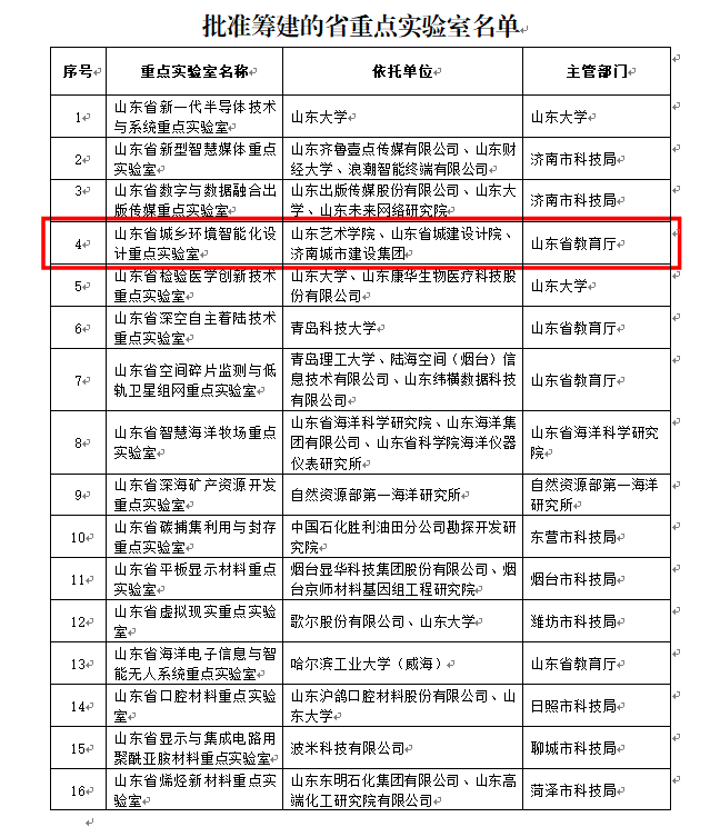 12月30日,山东省科技厅发布《关于批准建设山东省新一代半导体技术与系统等重点实验室的通知》,公布了批准筹建的省重点实验室名单,共有16家省重点实验室获批筹建。其中,由山东艺术学院、山东省城建设计院、济南城市建设集团共同申报的“山东省城乡环境智能化设计重点实验室”榜上有名。这是山东省艺术类高校成功获批的首个省级重点实验室,标志着山东艺术学院在省部级科研平台建设方面取得了历史性突破。