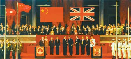 作品大气磅礴,气势非凡,格调高昂,洋溢着恒久的魅力。整个画面以浓重的红色为基调,间以黑色的庄重,呈现出热烈、厚重和辉煌的气势,具有极强的视觉感染力和冲击力。画面强调直线与方形的造型,烘托出整体结构的浑厚与凝重,并且注重动静结合、以静为主的构图形态,显现出纪念碑式的大气与伟岸。其间出现的近百个人物,形象逼肖,感情丰富,众多在世界政坛以及我国政治生活中举足轻重、具有较大影响的人物栩栩如生,活现于画面之上。特别是中英双方领导人的表情和神态,表现得更为丰厚和逼真。
