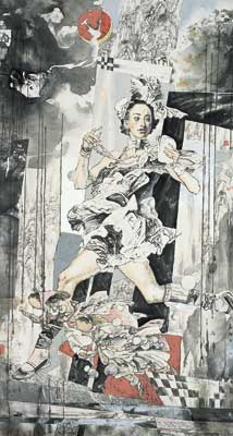 文房中的“四宝”,也是“器”,它使中国画在世界艺术之林占有一席之地,而且独具特色。多少年来,中国画“笔耕砚田”,已臻完美。但社会发展太快了。100万年前,我们是猴子,我们用90万年学会了“利其器”,又用了10万年学会了用火。5000年前,我们开始使用文字。可是近200年又发生了什么?近20年来又发生了什么?“日新月异”不足道,应该是“日日新”。100年前我们只有中国画,50年前我们有了真正意义上的水彩、油画、版画等等。近20年来,架上绘画日渐萎缩,我们又有了装置艺术、多媒体艺术、行为艺术……囿于“文房四宝”的中国画,如何适应“日日新”的社会发展?如何适应经济一体化的世界?如何适应文化“地球村”的环境?这是相当一部分中国画画家面临的课题。材料技法的革命,无疑为中国画的发展拓宽了空间,起码它从中国画技法的“虚实”中又延伸出了“软硬”,从水墨、植物颜料、矿物颜料等软材料发展到金箔、赤贝等金属材料。当然我敬佩和欣赏那些用文房四宝坚守国粹的人们,正所谓“多元”嘛。也许,只有多元的中国画,才是中国画的发展方向。