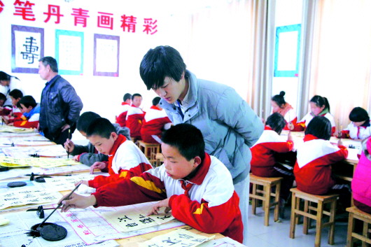 山东艺术学院志愿者协会16名志愿者利用节假日到济南市长清区归德镇中心小学开展爱心支教活动,为孩子们安排了书法、工笔画、舞蹈、朗诵、健美操等教学内容。