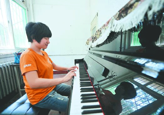 7月11日上午,记者第一次与王秋懿近距离接触,见面的地点约在她上课和生活的山艺校园。橘黄色的T恤搭配牛仔裤,背着斜挂包,听见有人和她打招呼,她总会马上将头转向声音的方向,给出热情的回应。王秋懿出生在青岛,一降生就生活在没有光线的世界里,这也让她的听觉格外敏感。“小时候我没事就听磁带,特别喜欢听钢琴曲子。”出于敏感的音乐感知,往往听完一首歌,她就能学会唱,这让父母看在眼里、记在心里。5岁那年,王秋懿收到一份特殊的礼物——钢琴,从那时起,她就与钢琴结下不解之缘。