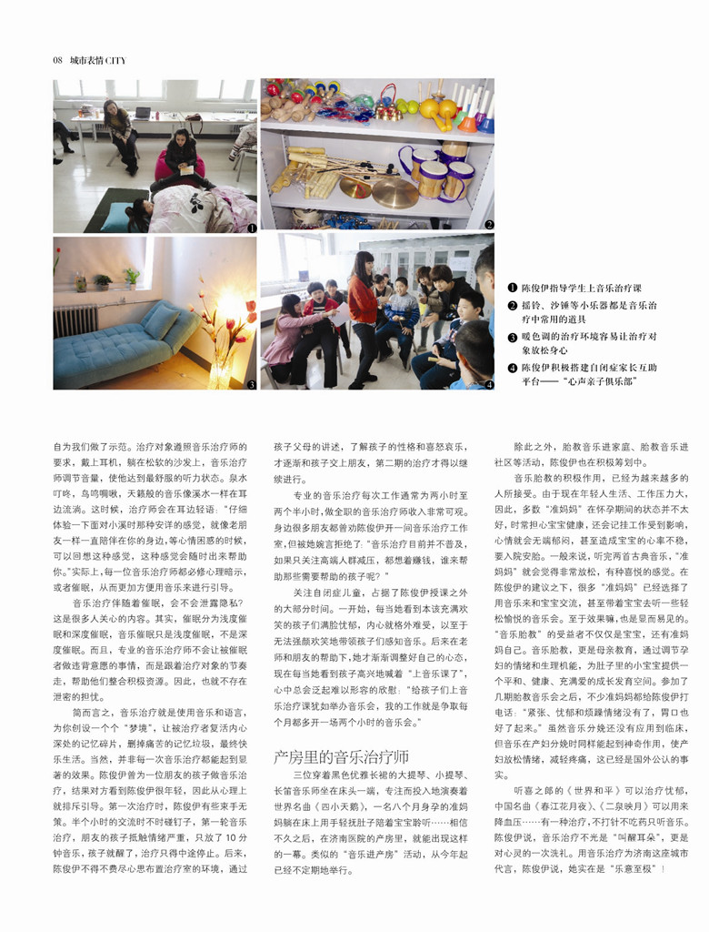 听喜多郎的《世界和平》可以治疗忧郁,中国名曲《春江花月夜》、《二泉映月》可以用来降血压……有一种治疗,不打针不吃药只听音乐。陈俊伊说,音乐治疗不光是“叫醒耳朵”,更是对心灵的一次洗礼。用音乐治疗为济南这座城市代言,陈俊伊说,她实在是“乐意至极”!