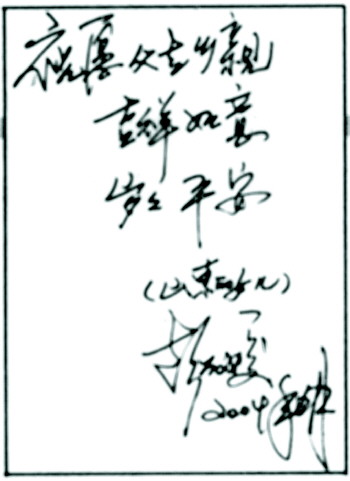 印象中的彭丽媛,很亲和,没有好多明星的“范儿”,说话语速有点儿快。上舞台前,笔者请她给《大众日报》读者写几句话。她想了想,说还是演出结束,到房间里写吧,在外面心不静。笔者当时很担心,因为好多明星,也是这样,答应给写了,结果一回到房间,就没了下文。笔者忐忑着,一直等到晚上十点多,宾馆服务员帮着联系,彭丽媛开门,把写好的字递到笔者手里。写的是:“祝愿父老乡亲,吉祥如意,岁岁平安。山东的女儿彭丽媛。”她还笑着说,写完稿子,我能先看一看吗?第二天,笔者把写的稿子传给她看了,她一个字也没改。