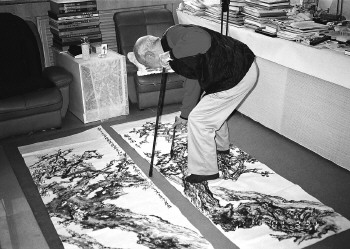 2001年1月,于希宁在寓所拄杖创作。