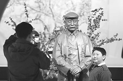 日前,由省委宣传部、省文化厅、省文物局和省文联联合建设的“山东名人馆”在山东博物馆开馆。首期入选“山东名人馆”山东籍名人,包括王献堂、于希宁、张登堂、刘国松等。图为前来参观的市民在“一代梅痴“于希宁先生塑像前留影。
