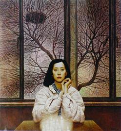 在这幅作品中,王力克用照相写实手法,着力刻画了一位仿佛自祝生日的青年女子及窗外的枯树与雀巢。画面以单纯的紫灰色调子衬托出女子娇好的容颜。纷繁而有序的树枝映衬出青年女子那如麻的思绪,对未来美好生活的憧憬与向往,也暗寓了现代人在寻求精神归宿中企望宁静与孤独的心态。作者说:“愿画中那点燃的蜡烛也能点燃我们那永恒的精神世界。”