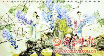 梁文博起石,添紫藤,王小晖绘仕女。两人作画时讲究人景呼应、色彩相宜,设色时还请沈光伟给出意见,以臻完美。两位画家交流互动颇多,谈笑风生流露出率直洒脱的真性情,最后落成画面色彩丰富、温润,诗意浓郁。