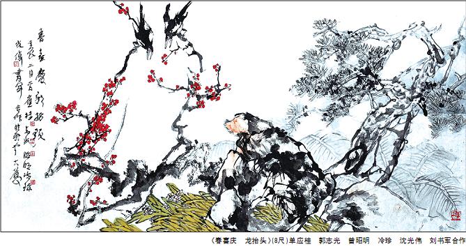 在这次笔会上,诞生了两幅8尺整幅的重磅国画精品,一幅是丁宁原、吴泽浩、张宝珠、张志民合作的《泰岱松云》,大气磅礴;一幅是单应桂、郭志光、曾昭明、冷珍、沈光伟、刘书军合作的《春喜庆 龙抬头》,灵动清新。