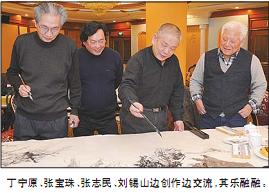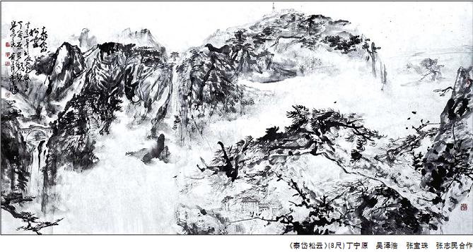 山水画《泰岱松云》由张宝珠先生开笔,古松奔放飘逸;张志民先生皴擦点染,层峦叠嶂,写山之雄奇;丁宁原先生细笔勾勒小桥流水,在苍茫大气的境界里,增添颇多诗意;吴泽浩先生添绘数条梅枝,逸笔营造烟云浩渺的氛围;丁宁原先生在画面上补添泰山标志性建筑,并风趣地说:“别看我画的房子小,当前房价高的形势下,很值钱。”引来笑声一片。山石、松柏、云水、亭台,展现在我们面前的《泰岱松云》,堪称难得的山水画精品。