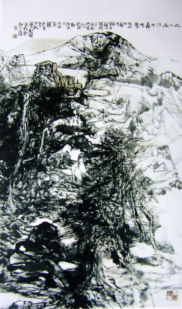 我曾在一篇评论中,将中国目前的山水画坛分为北京、江浙和西北三大板块,并认为这三大板块对其他地区具有一种审美辐射力。但至今思量起来,可能是我的孤陋,我将山东地区忽略了。至少是在我看到了张志民的画作后,这种感觉似乎更加强烈——实际上,一个地区,一种画风的崛起往往就在于有一批手眼不俗的画家能够崭露头角,也更赖于这批画家中能有一两个大手笔者能够从中脱颖而出,统领风骚,北京画坛有了李可染,遂使这一区域的山水画有了属已的沉沉穆穆的语言格局和气象;江苏画坛有了傅抱石、钱松岩,所以这一区域的山水画至今依然风光不衰;而长安画坛有了赵望云和石鲁,那种雄厚磊落的笔墨意态在其后继者手中才会再度重现,发扬光大。我想张志民就属于山东画坛上这样的人物。虽然他还无法和先辈大师的成就相比肩,但他那墨气四射,令天地为之低昂的绘画形态不仅蓄含着不可掩抑的生气和激情,而且也预示着一种风流超越的势态。正是这样,我们看到有不少评论说他的山水画“圆浑苍厚、大气逼人”,说他构筑了一个“天地人合一的人格精神的超越境界”。说他是“齐风领军人物”,“在极高的层次上凸现着个性的光芒”等等,是有道理的。可以说,我们从张志民的超越身姿中看到了中国山水画坛又一派生力军突起之可能。