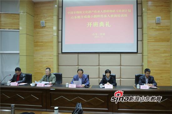 11月16日上午,山东艺术学院承办的文化部、教育部中国非物质文化遗产传承人群研修研习培训计划·山东省地方戏曲小剧种传承人表演培训班开班典礼在长清校区举行。山东省文化厅非物质文化遗产处处长姜慧,山东艺术学院纪委书记兰绍彤出席,山东省地方戏曲小剧种传承人表演培训班全体学员,学校艺术实践与创作处处长、戏曲学院负责人及戏曲学院师生代表参加了开班仪式,仪式由戏曲学院院长王文清主持。