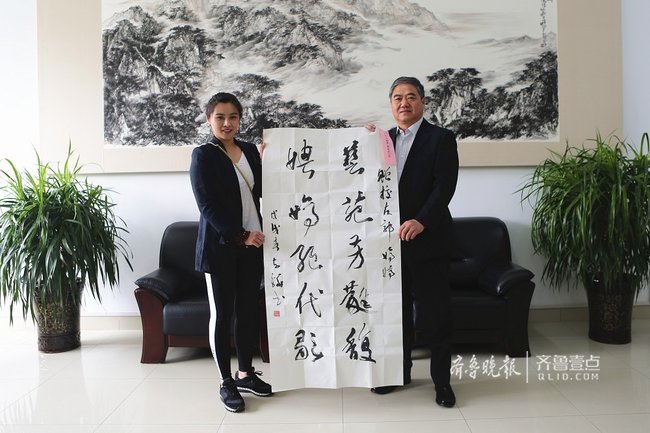 仪式前,马东骅、王力克、孔祥华亲切会见了郭婷婷一行,马东骅还挥毫赠郭婷婷精美书法作品一副:“艺苑芳蕤馥,娉婷绝代歌”,表达了学校的感谢之情。