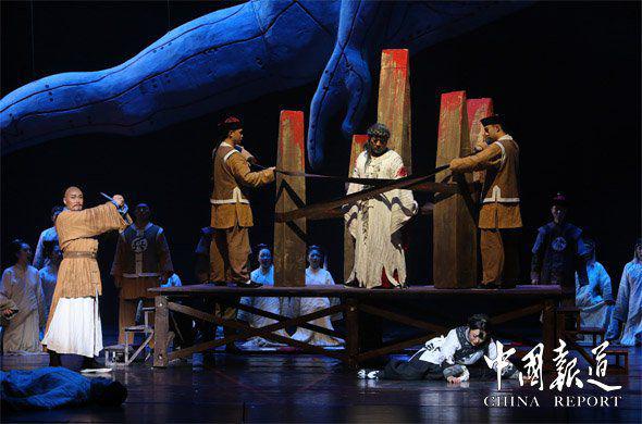 演出现场,巨型面部、手部、脚部等舞台造型,可谓惊艳,极具视觉冲击力。在每一幕开始前,最先亮相的都是国家级非遗山东琴书传承人姚忠贤饰演的“琴书艺人”,他边拉琴边说唱出一段故事,既有浓厚的山东特色,又极富感染力。演员饱满的情绪表达,动人的歌声和厚重、优美的音乐交相辉映,不时赢得观众热烈的掌声。现场观众表示,《檀香刑》呈现的是一个史诗式的故事,令人感动和震撼,很好地体现了那个时代的人性和情感,爱国热情和抗暴精神,而且歌剧在音乐创作上突出了民族元素,大胆运用山东琴书这种传统说唱形式与歌剧构成双重叙事结构,并在旋律、和声等方面吸收了高密地方戏曲茂腔的艺术特色。这是一台有水准、有份量、气势宏大、感人至深的大型民族歌剧。演出结束后,掌声雷动,久久不能停息。