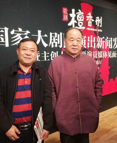 根据莫言同名小说改编的原创歌剧《檀香刑》将于12月4日、5日在国家大剧院隆重上演。这是继济南、潍坊、临沂、南京、青岛巡演之后的第16、17场演出。11月12日下午,著名作家莫言和《檀香刑》剧组主创人员在北京国家大剧院出席媒体见面会。