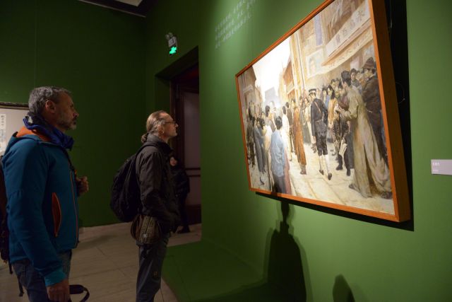观众在山东艺术学院建校60周年美术作品展览现场观摩王力克的巨幅油画作品《甲午.1894》(11月22日摄) 。新华社发 (常秀芹 摄)