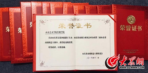 山东艺术学院传媒学院获得第三届山东省动漫创意大赛的优秀组织奖,王晨、谢征获得优秀指导教师奖。