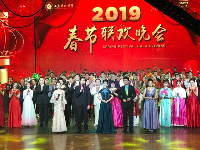 1月18日,山东艺术学院2019年春节联欢晚会在文东校区艺术剧场举行。山东艺术学院党委书记马东骅、院长王力克,山东省审计厅原巡视员李建军,山东省教育厅体育卫生与艺术教育处处长孙乐为,山东影视传媒集团副总经理、山东电影家协会副主席、国家一级艺术指导牛烟生,山东艺术学院党委副书记孔祥华、纪委书记兰绍彤,山东艺术学院离退休老领导代表、全校教职员工及社会各界人士近两千人一同观看晚会。