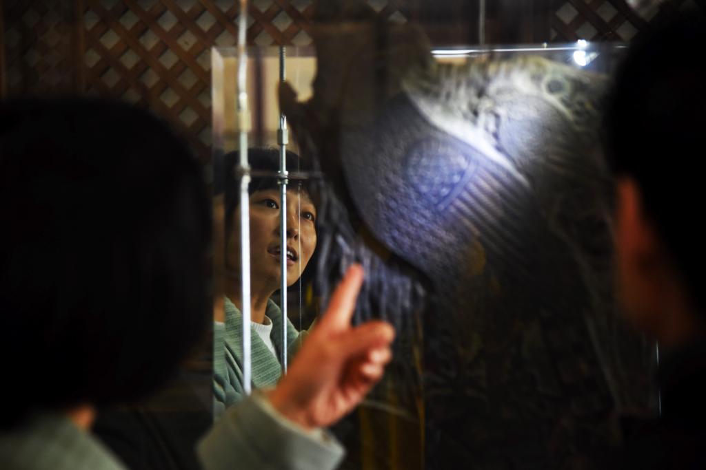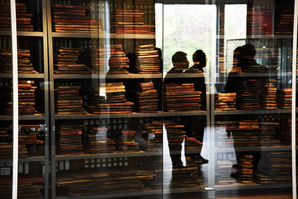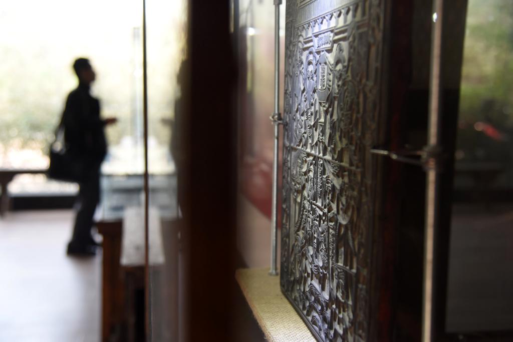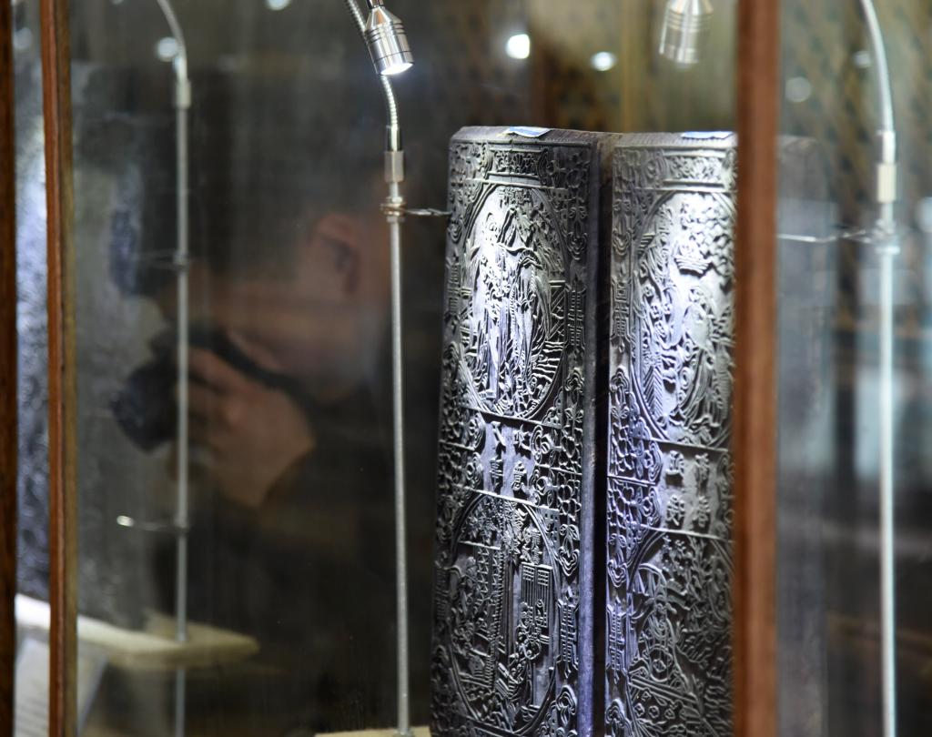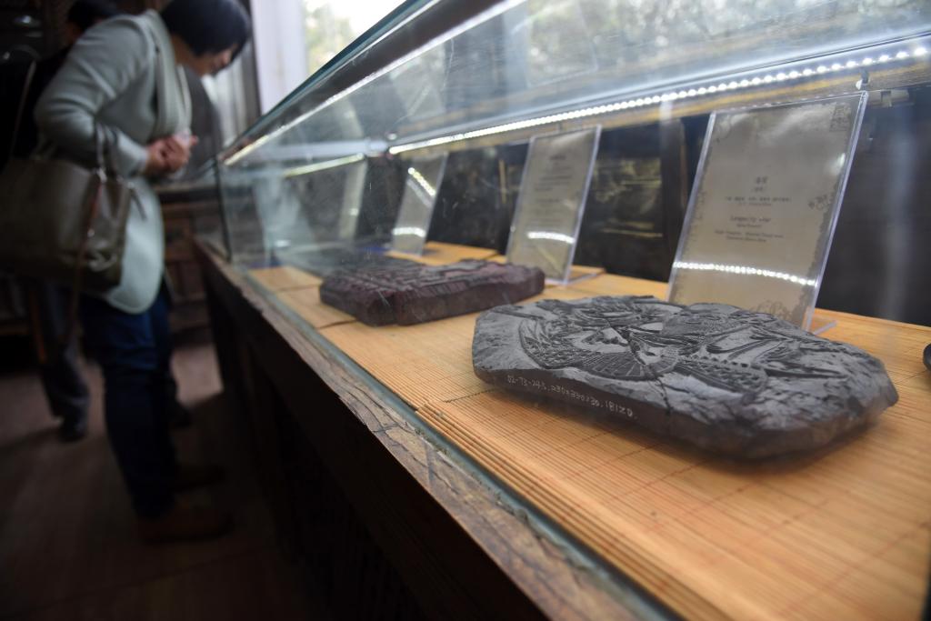 4月10日,参观者在山东艺术学院年画艺术研究中心的研究基地——山东艺术学院年画雕版博物馆里参观。